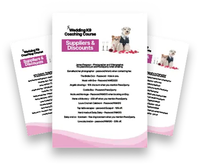 Your complete toolkit to transform your dog into the perfect wedding guest. Inside, you’ll find video lessons, quick-reference guides, and real-life tips to make training fun, fast, and stress-free.