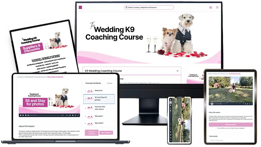 Step-by-step, easy to follow video lessons to prepare your dog for the big day, including lessons such as: